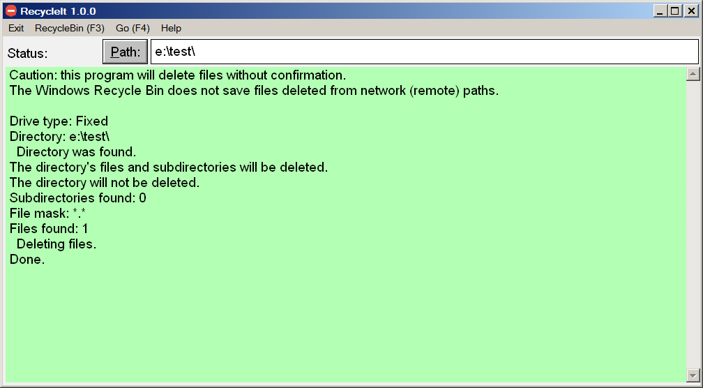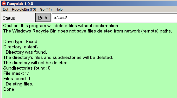 RecycleItThis software is no longer being developed, because NeoBook has ended its software development.Send local and network files to the Windows Recycle Bin via command line! RecycleIt is a portable, freeware, Windows program that deletes local and network files and folders by sending them to the Windows Recycle Bin. The program can be used after a synchronization procedure, to remove empty subdirectories and older files. Files and folders to delete may be specified in any of the following three ways.